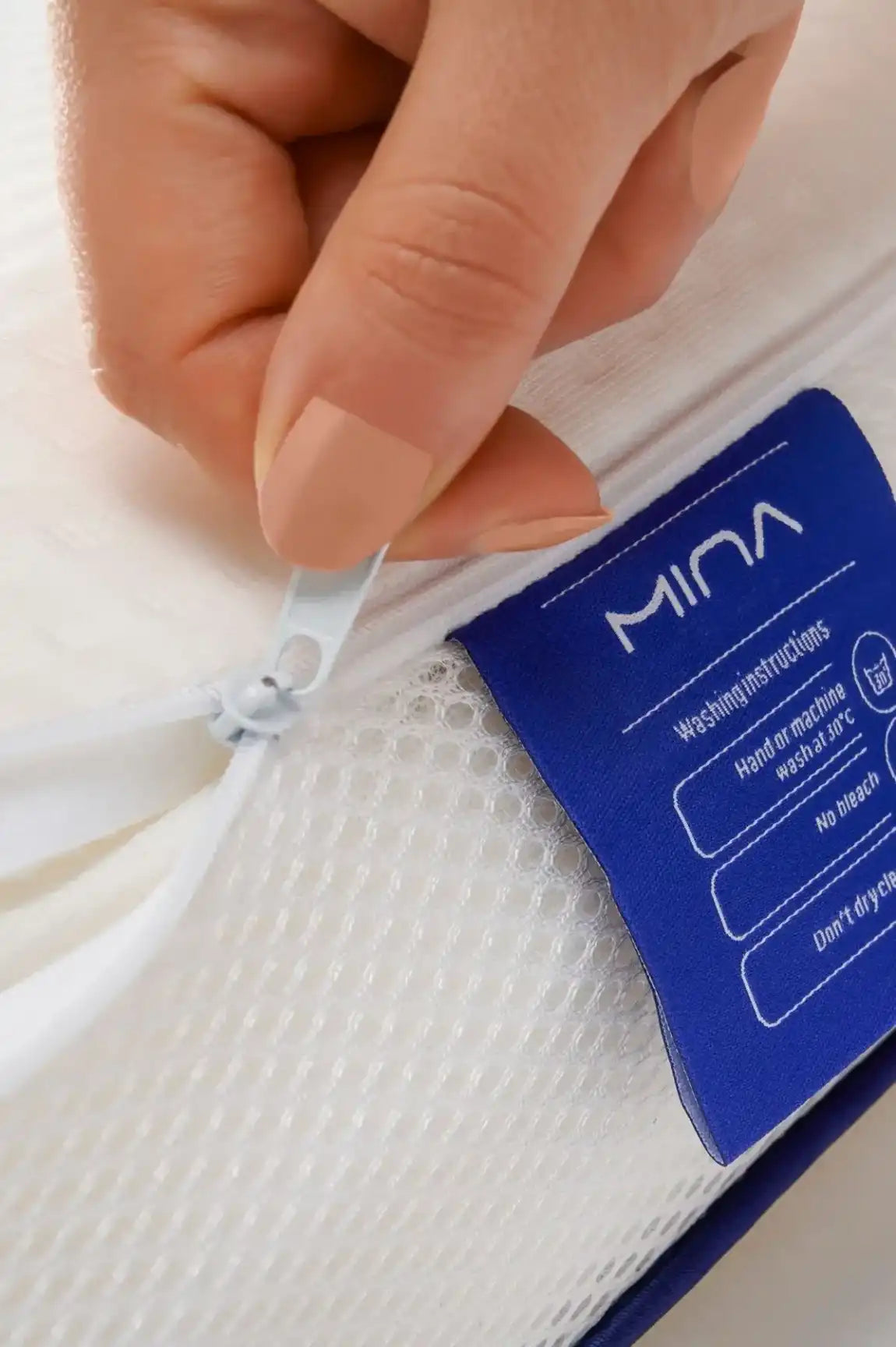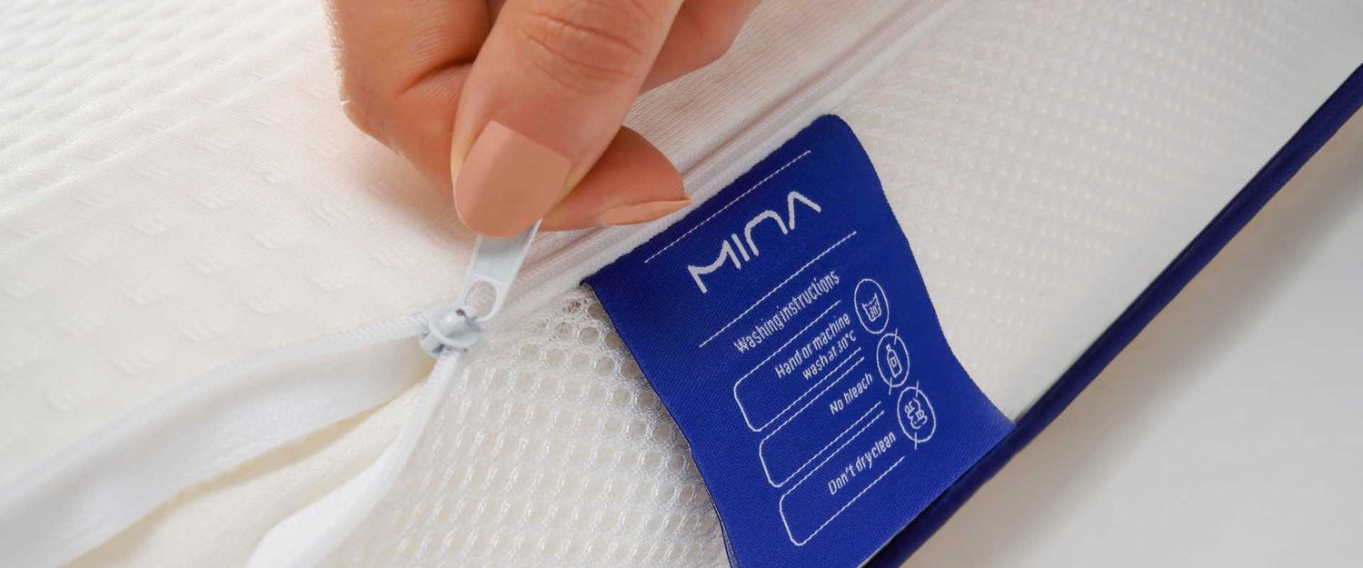Mina Climate kumaştan üretilmiş fermuarlı dış kılıf, 30 derece ve 400 devirde makinede yıkanabilir. İç dolgu kısmı ise nemli bir bezle kolayca silinebilir.